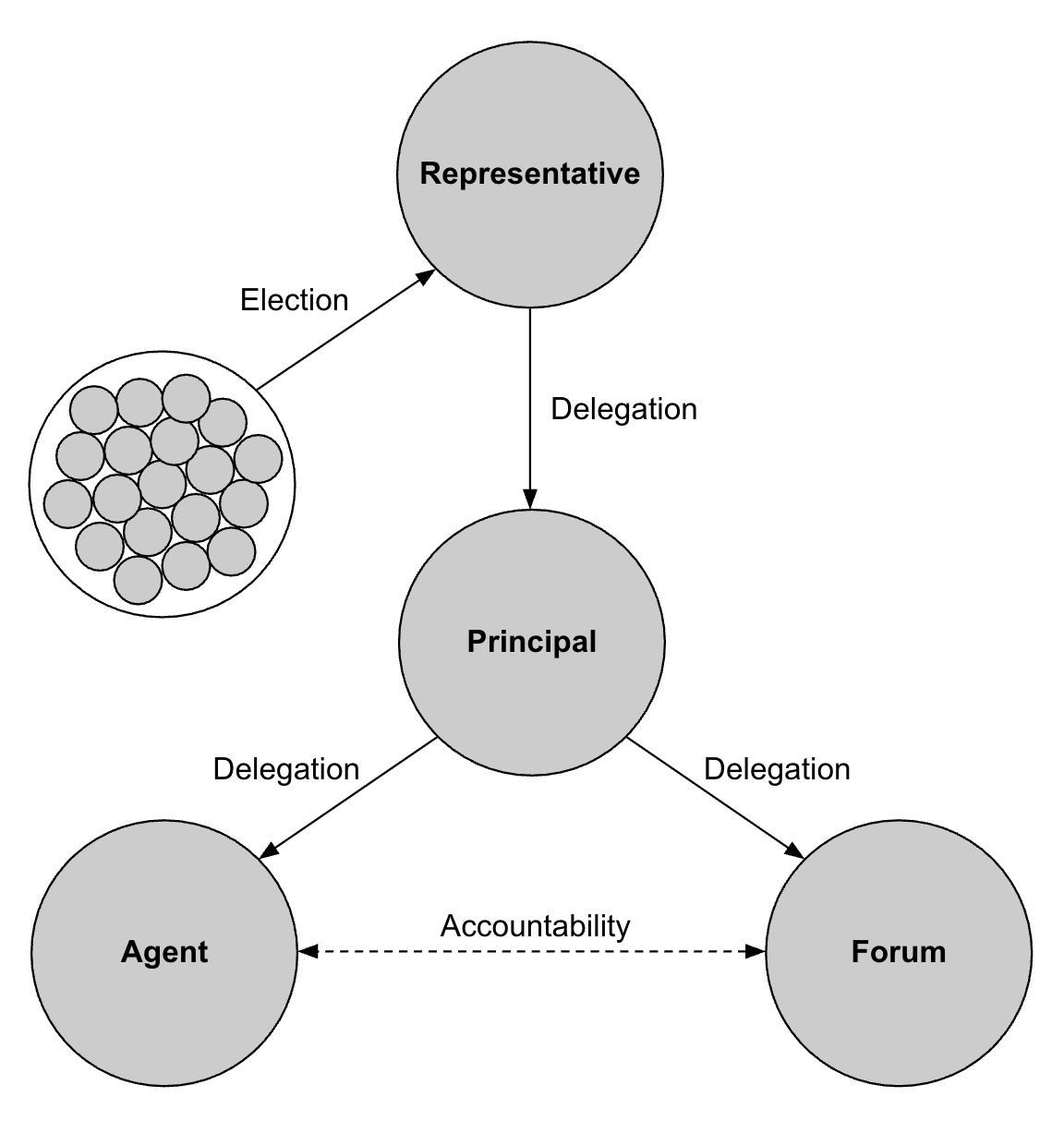 Bovens goes on to write that “Accountability is a form of control, but not all forms of control are accountability mechanisms.” Indeed accountability arises as a response to the problem of delegation in principal-agent relationships where a principal delegates some tasks to an agent which acts on the principal’s behalf. Accountability is the mechanism to constrain this delegation relationship by making the agent answerable to a forum for its conduct (sometimes the forum is just the principal itself). In essence the principal delegates a task to an agent and then monitors the execution of that task, or further delegates this monitoring to a forum which can judge the behavior and enact sanctions if needed. The following diagram illustrates how an accountability relationship is established with authority flowing originally from a democratic election process and where the principal delegates both the task and the monitoring of that task.